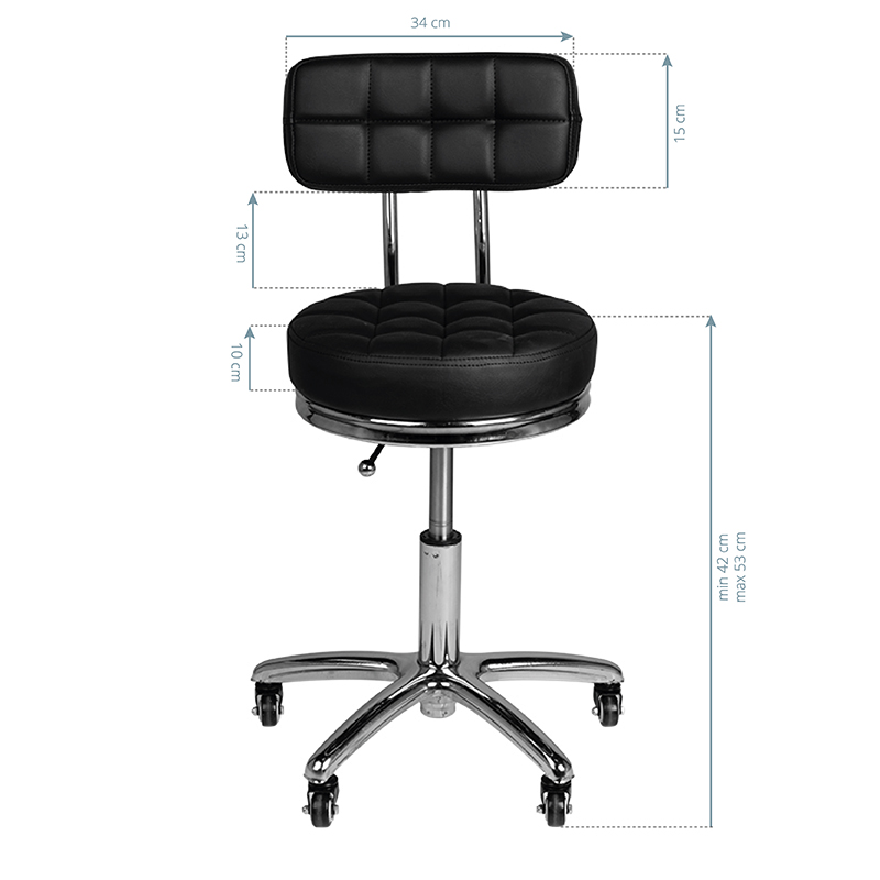 Taboret kosmetyczny w kolorze czarnym z pikowanym siedziskiem i wygodnym oparciem. Posiada regulację wysokości i pęcioramienną podstawę wyposażoną jest w solidne metalowo-gumowe kółka.