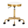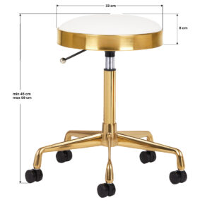 Ten złoty taboret ma wygodne białe siedzisko pokryte skórą ekologiczną. Znajduje się na stabilnej pięcioramiennej podstawie. Stworzony ze stopów metali, jest trwały i odporny na zniszczenia. Wysokość siedziska jest sprawnie regulowana. Plastikowe kółka pozwalają na łatwą zmianę położenia. Siedzisko jest w pełni obrotowe.