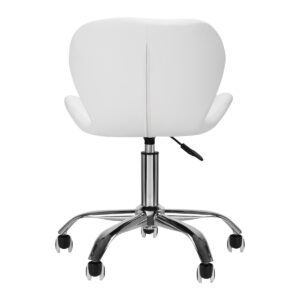 Pięcioramienna podstawa w odcieniach chromu wyposażona jest w gumowane kółka, które zapewniają znaczną mobilność, umożliwiając swobodne przemieszczanie mebla po gabinecie. Siedzisko taboretu zostało obite przyjemną w dotyku imitacją skóry w eleganckim odcieniu bieli. Zastosowany materiał gwarantuje trwałość, odporność na wilgoć oraz łatwość w utrzymaniu czystości. Całość dopełniają stylowe przeszycia, które podkreślają nowoczesny design.