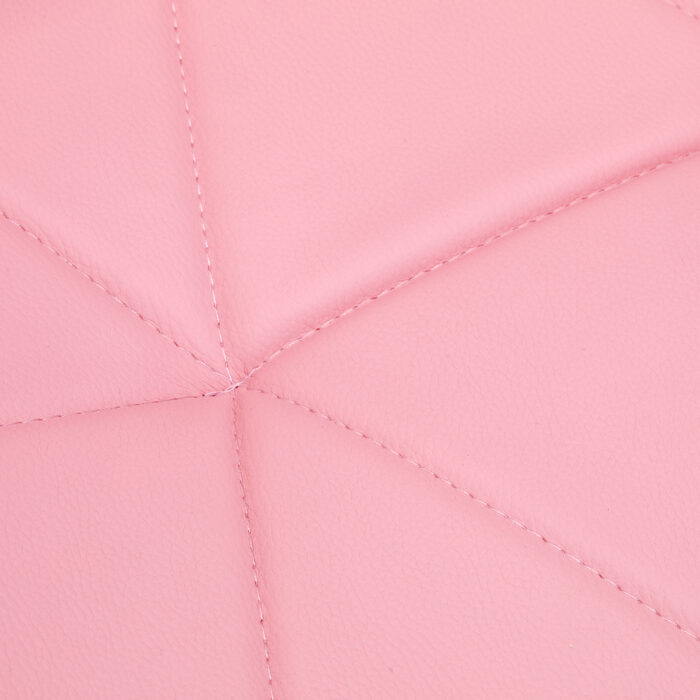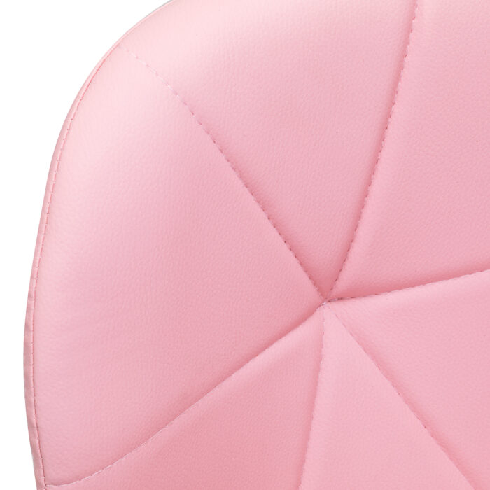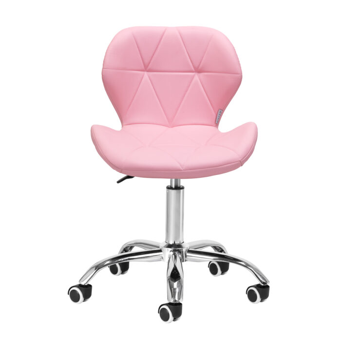 Pięcioramienna podstawa w odcieniach chromu wyposażona jest w gumowane kółka, które zapewniają znaczną mobilność, umożliwiając swobodne przemieszczanie mebla po gabinecie. Siedzisko taboretu zostało obite przyjemną w dotyku imitacją skóry w eleganckim odcieniu różu. Zastosowany materiał gwarantuje trwałość, odporność na wilgoć oraz łatwość w utrzymaniu czystości. Całość dopełniają stylowe przeszycia, które podkreślają nowoczesny design.