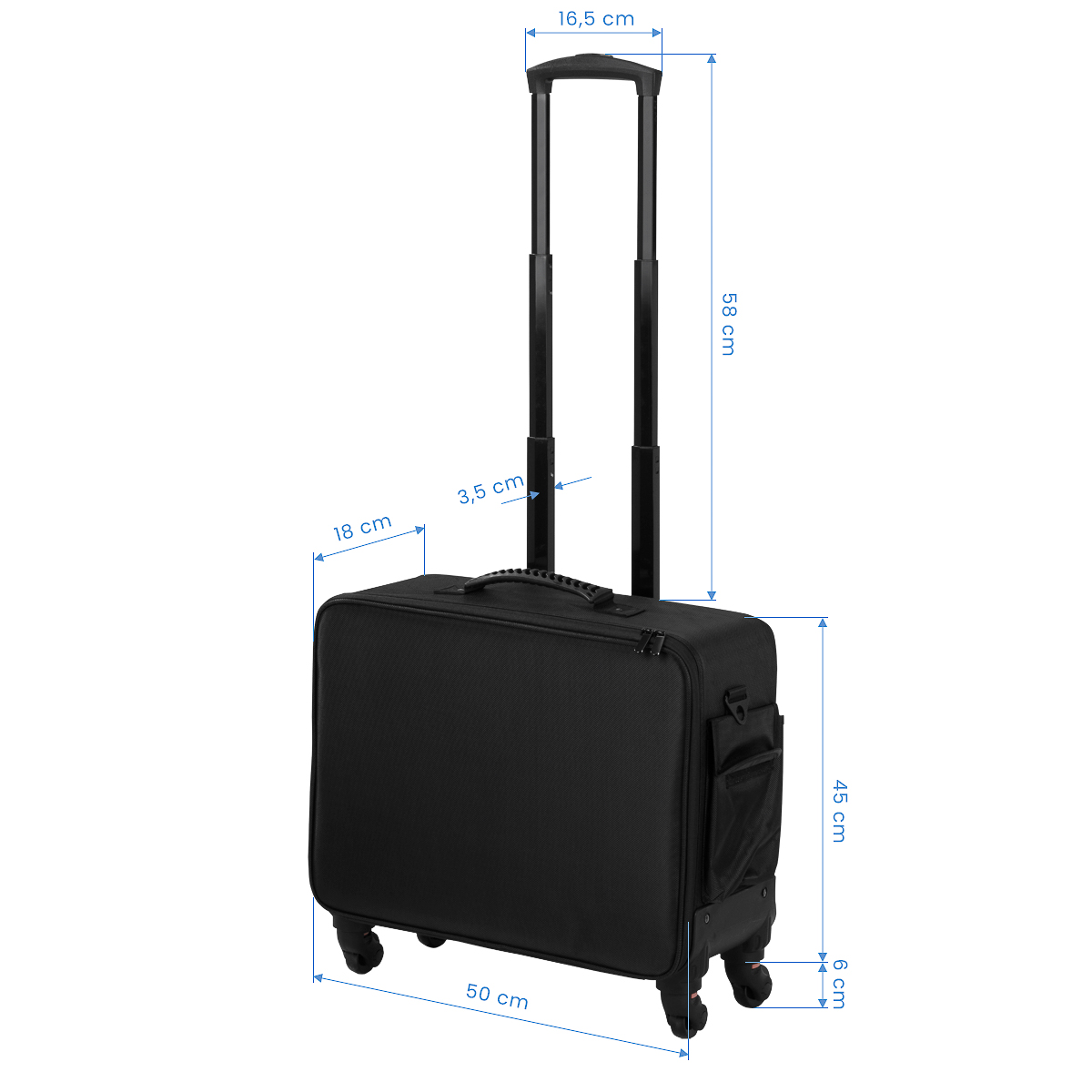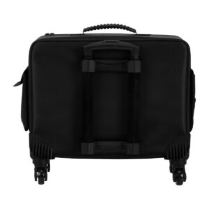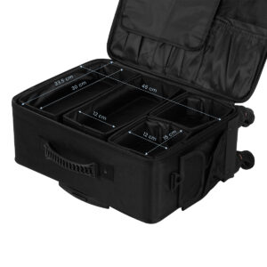 Walizka została wykonana z wytrzymałego, wodoodpornego nylonu, dzięki czemu jest odporna na uszkodzenia i łatwa w czyszczeniu. Uniwersalny czarny kolor nadaje mu elegancki wygląd, a liczne kieszenie, w tym duża główna komora z regulowanymi przegródkami oraz miejscem na cztery organizery (dwa mniejsze, dwa większe), zapewniają maksymalną funkcjonalność. Przemyślana konstrukcja ułatwia organizację kosmetyków i akcesoriów, pomagając utrzymać porządek. Nowoczesny design, mobilność i praktyczność sprawiają, że walizka jest niezastąpionym narzędziem dla profesjonalistów z branży beauty.