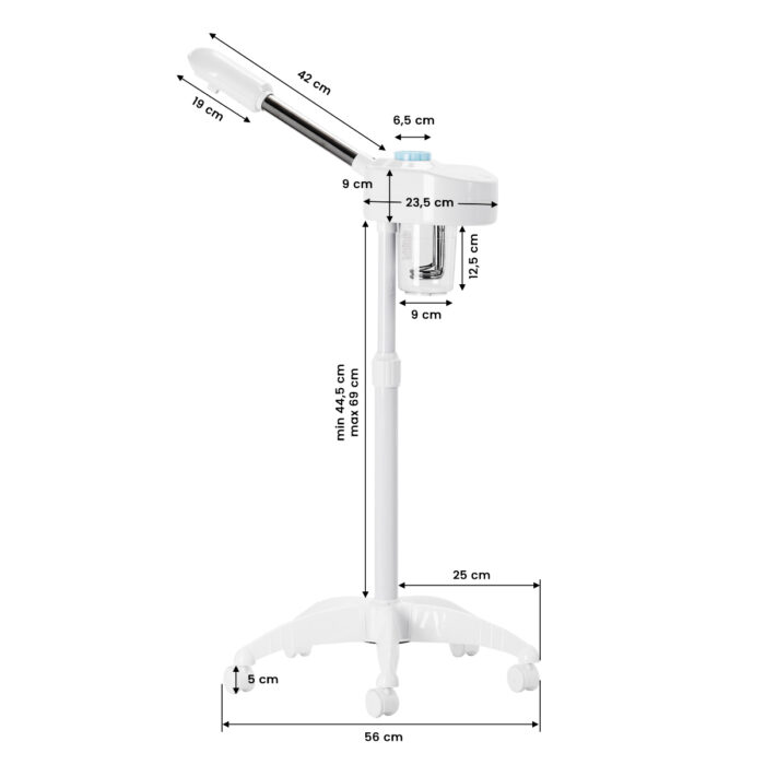 Wapozon wykonano z trwałego tworzywa sztucznego w odcieniach bieli, co sprawia, że urządzenie łatwo utrzymać w czystości. Statyw wyposażony jest w regulację wysokości w zakresie 44,5-69 cm, co pozwala na ustawienie sprzętu na odpowiednim poziomie, by zapewnić komfort pracy osobie wykonującej zabieg. Dyszę wapozonu można obracać, co zwiększa zakres możliwego ustawienia. Pięcioramienna podstawa z kółkami poprawia mobilność, ułatwiając swobodne przestawianie urządzenia.