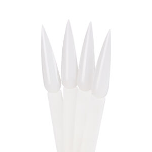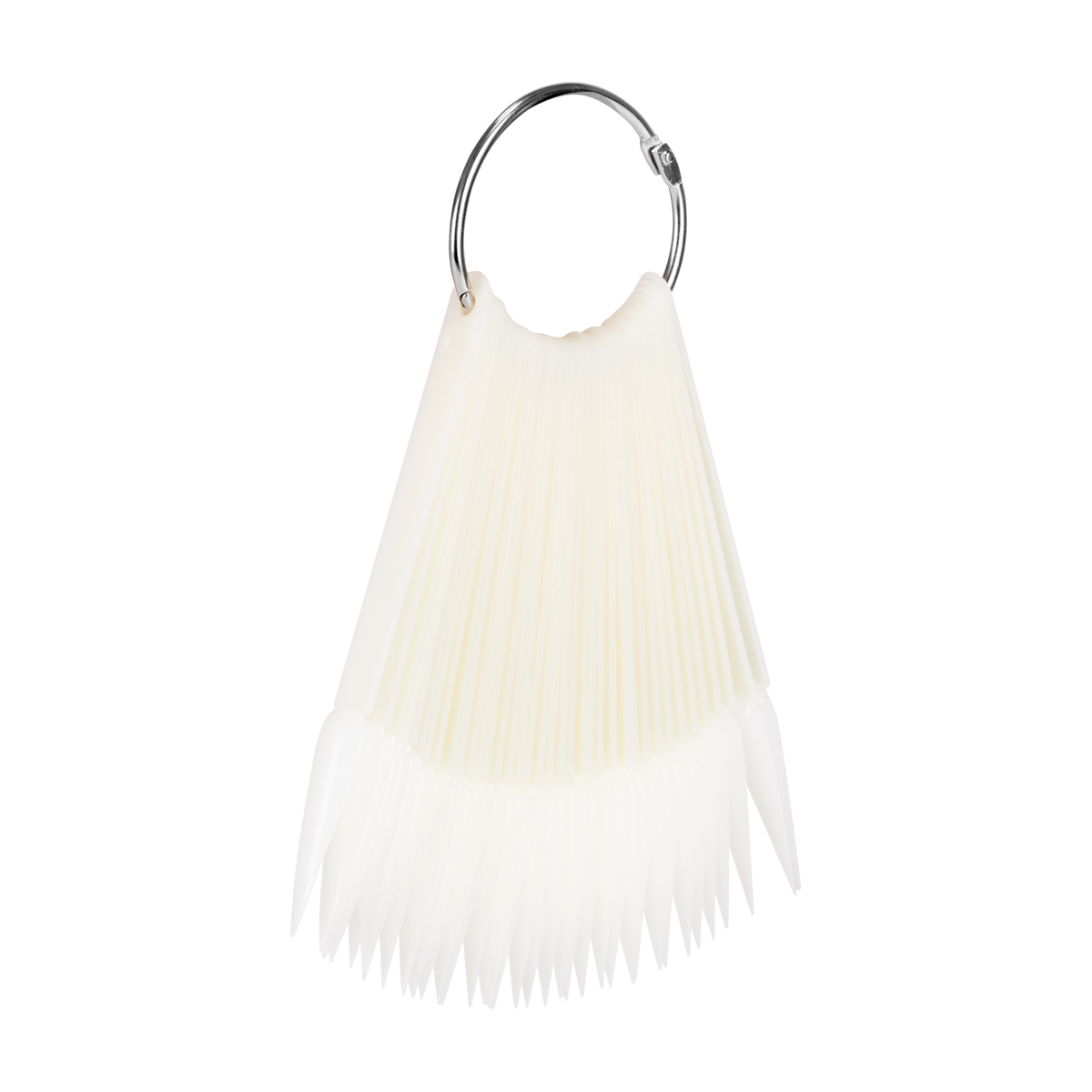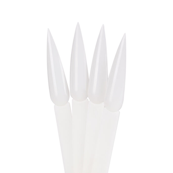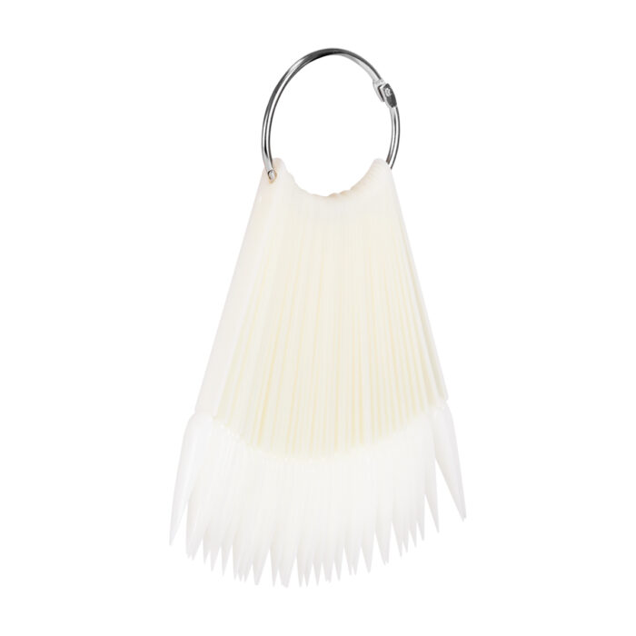 Wzornik w mlecznym kolorze pozwala na estetyczną prezentację wszelkich kolorów lakierów klasycznych oraz hybrydowych, pyłków czy żeli. Składa się z 50 pojedynczych tipsów o spiczastym kształcie. Spięty jest praktycznym, rozpinanym kołem, które ułatwia przechowywanie całości. Każdy z tipsów wykonano z trwałego tworzywa sztucznego.
