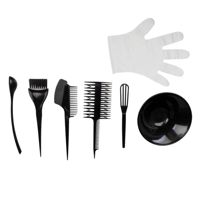 Profesjonalny zestaw narzędzi do farbowania włosów. Zestaw zawiera wszystnkie potrzebne narzędzia. 1 miskę do mieszania, 1 miarkę, 1 mieszadełko, 2 grzebienie do nakładania farby, 1 pędzelek do nakładania farby, 1 paczkę 100szt rękawic jednorazowych.Produkty te sprawią, że twoje farbowanie włosów będzie łatwe. Nadaje się do profesjonalnego fryzjerstwa w salonie.